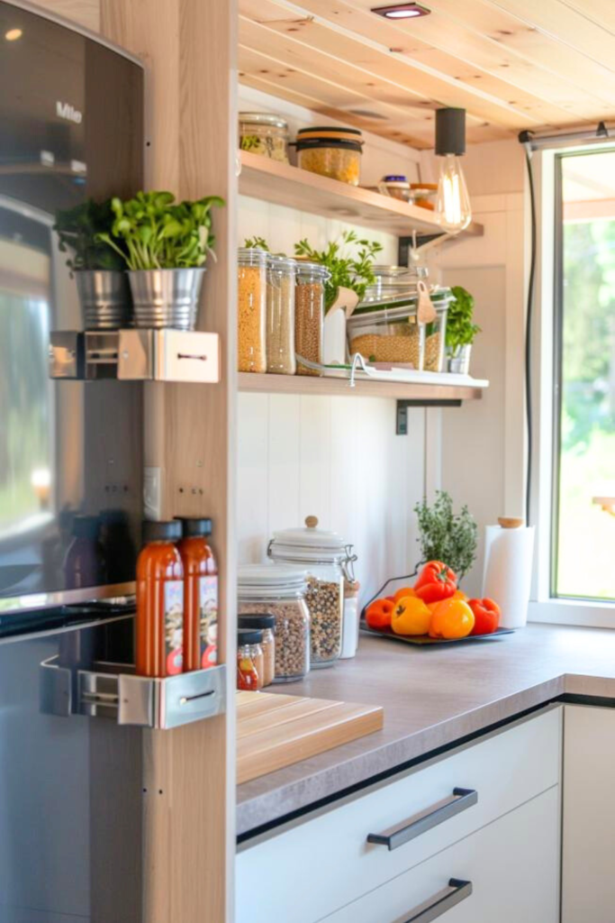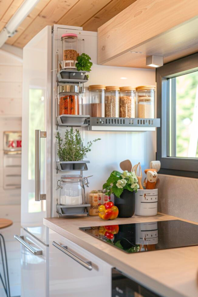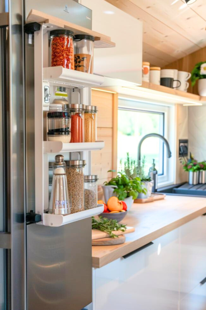 Make use of the side or front of your refrigerator by installing magnetic spice racks. This clever storage solution keeps spices organized and easily accessible while also maximizing space efficiency.