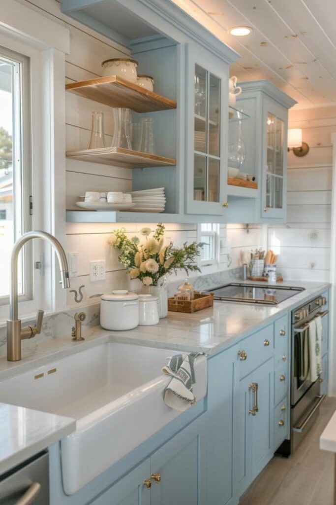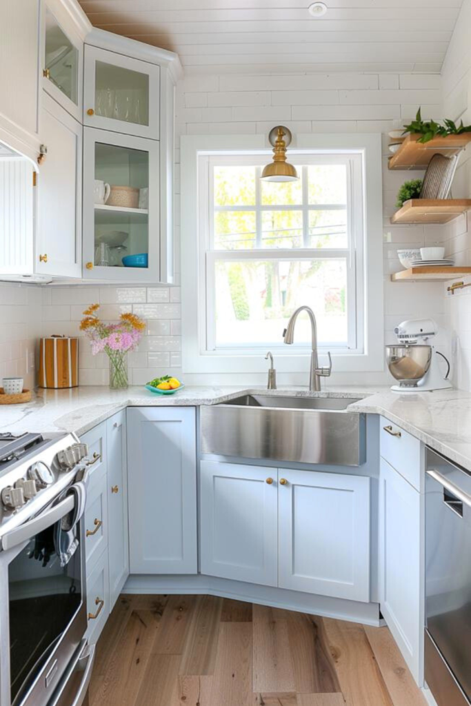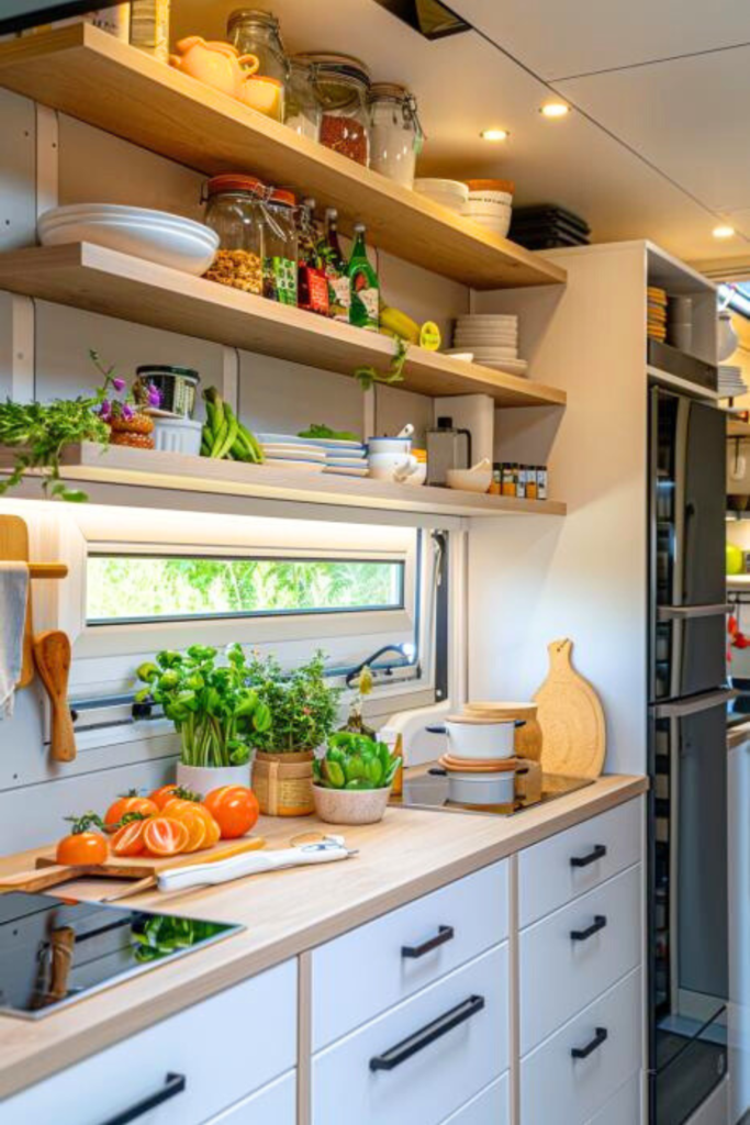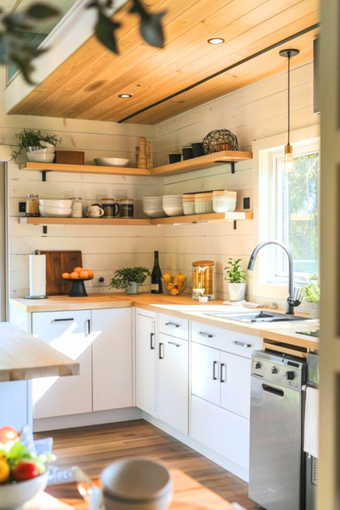 Utilize wall space efficiently by installing floating shelves above countertops or sinks. This provides additional storage for dishes, spices, and decorative items without taking up valuable floor space.