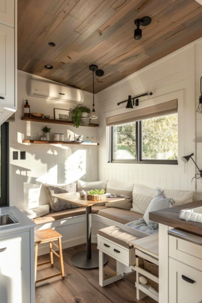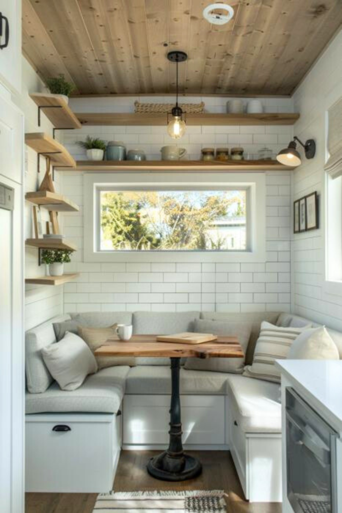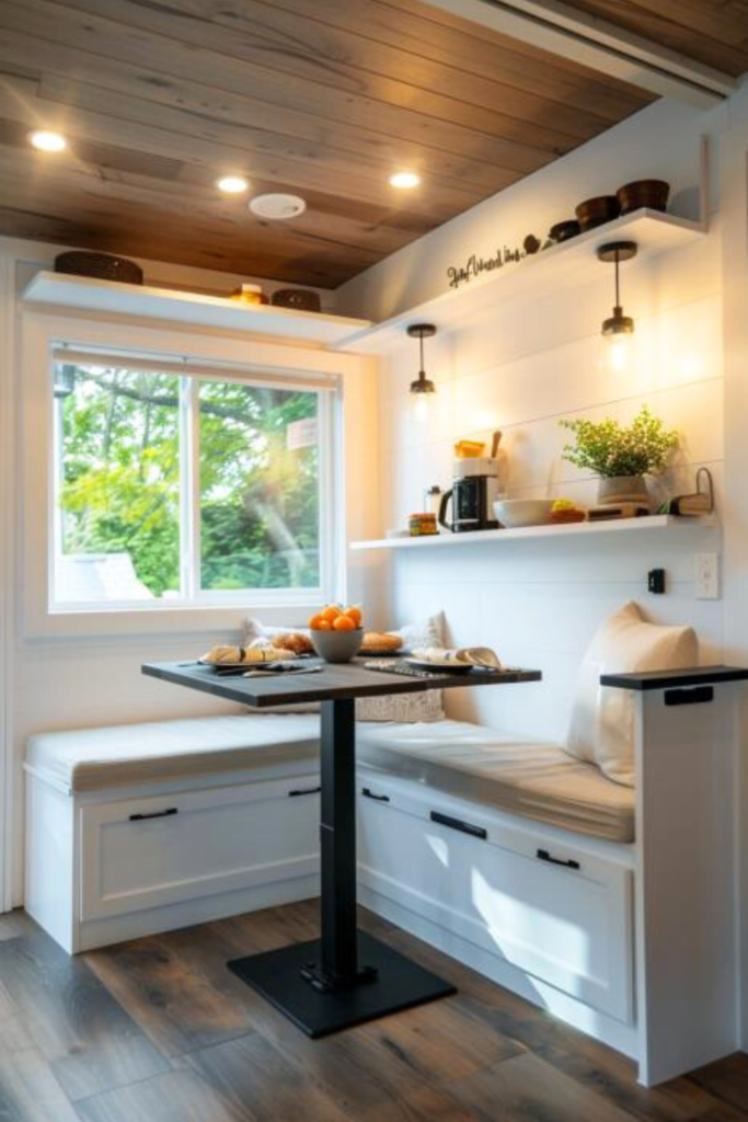 Make the most of limited dining space by designing a built-in breakfast nook with storage benches. This provides comfortable seating for meals while also offering hidden storage for linens, tableware, and other essentials.