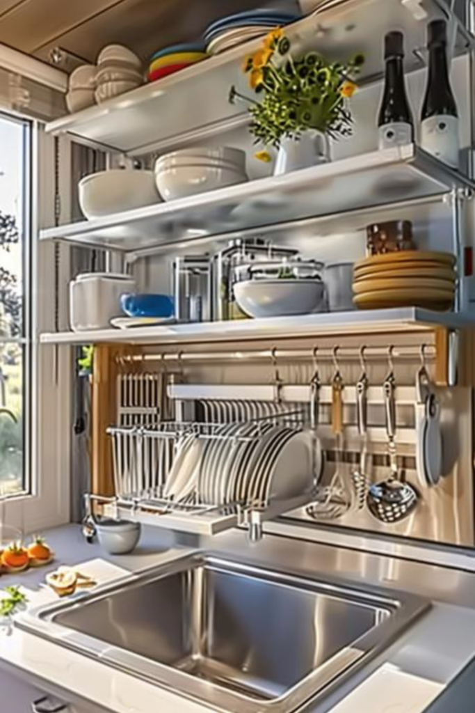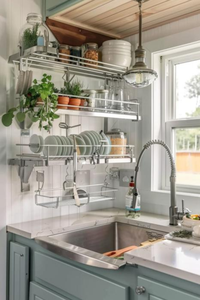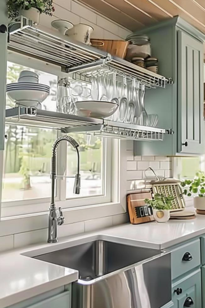 Maximize counter space by installing a foldable drying rack above the sink. This space-saving solution provides a convenient place to air dry dishes and utensils while also allowing water to drip directly into the sink.