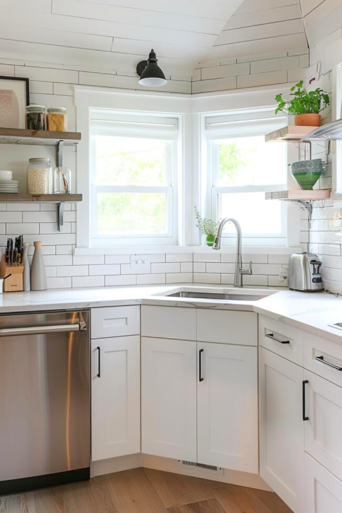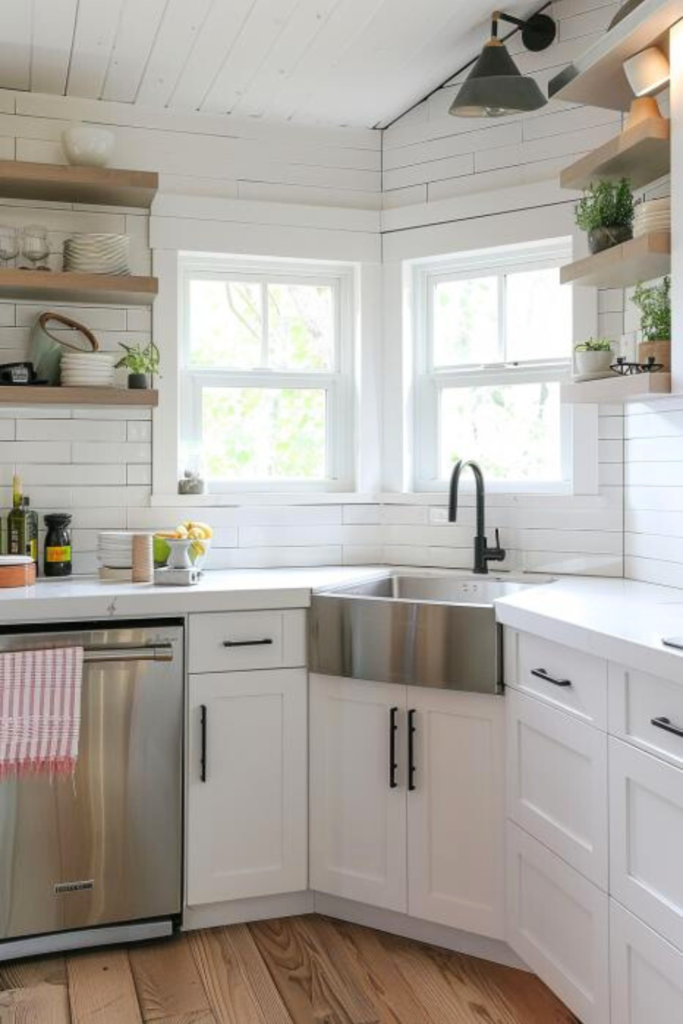 Opt for a corner sink design to maximize counter space in your tiny kitchen. This space-saving solution allows you to make the most of awkward corners while also providing ample workspace for food preparation.