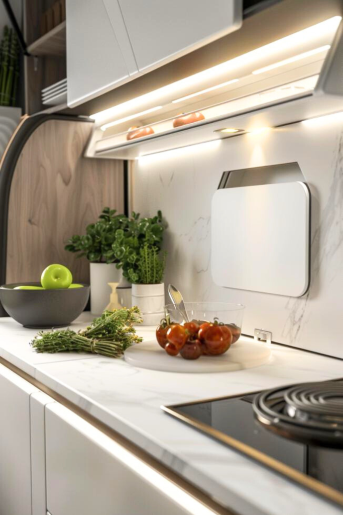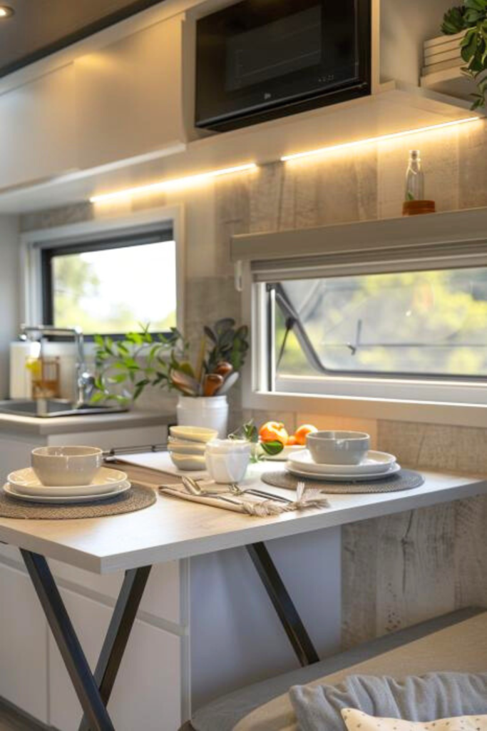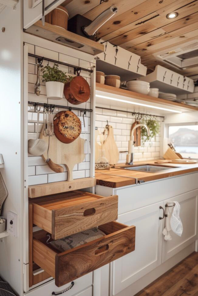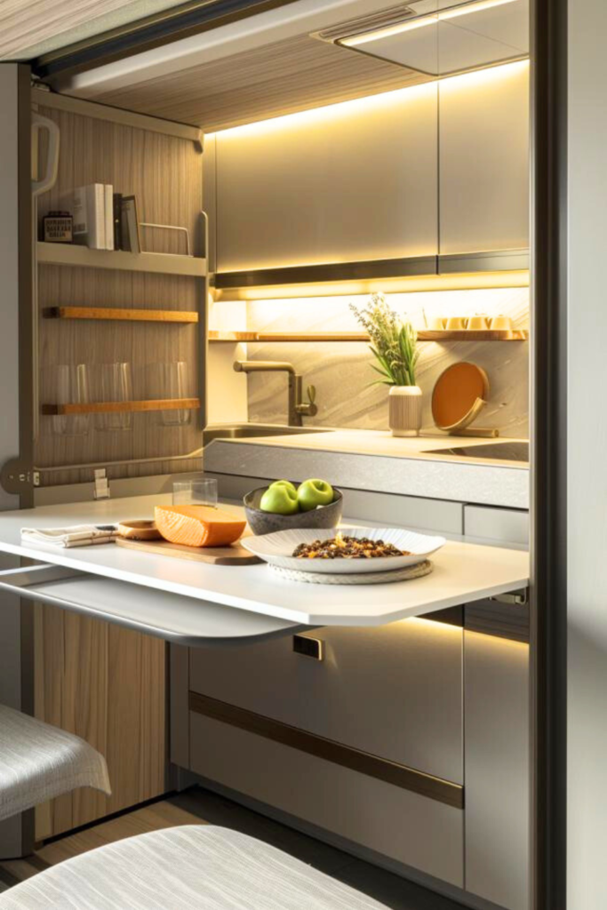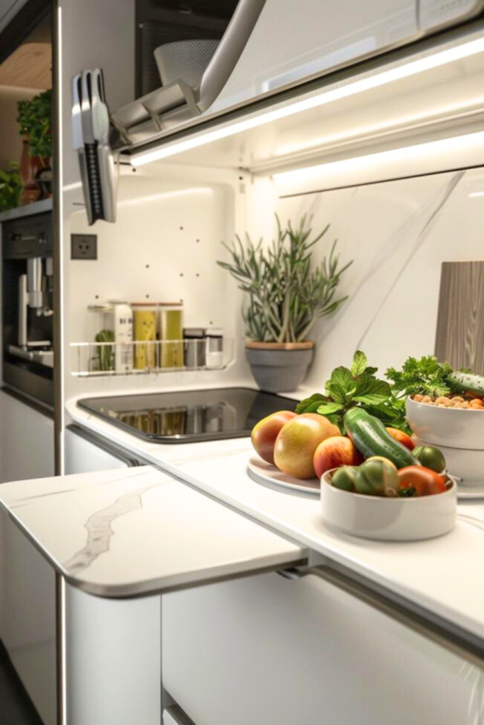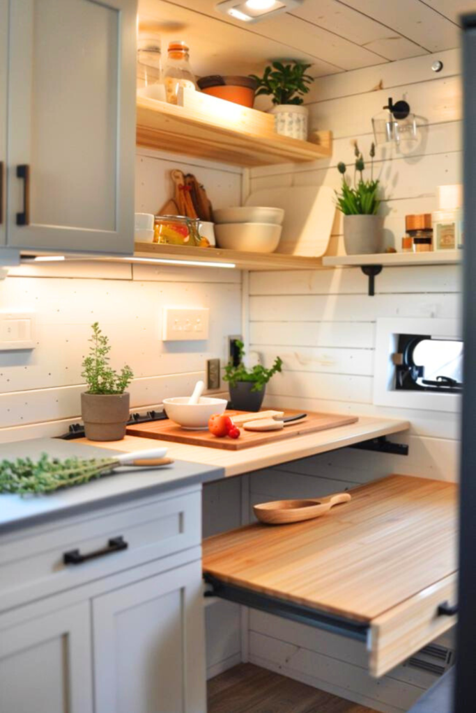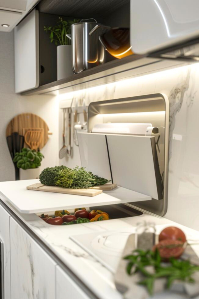 Maximize counter space by installing folding or retractable countertops that can be extended when needed and tucked away when not in use. This provides extra workspace for food preparation without sacrificing valuable counter space.