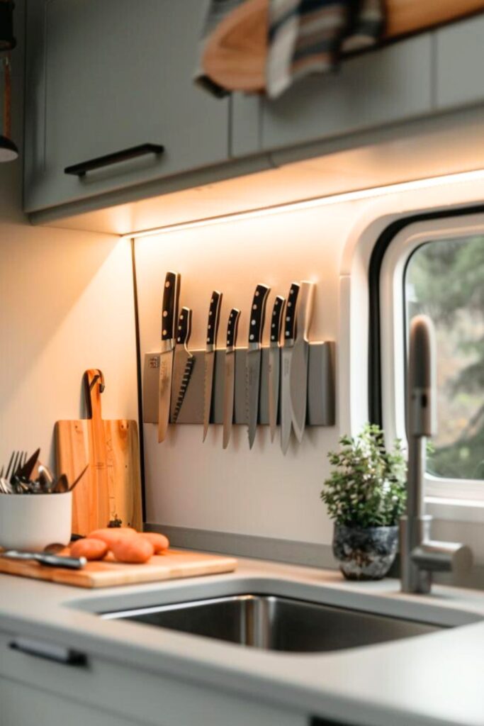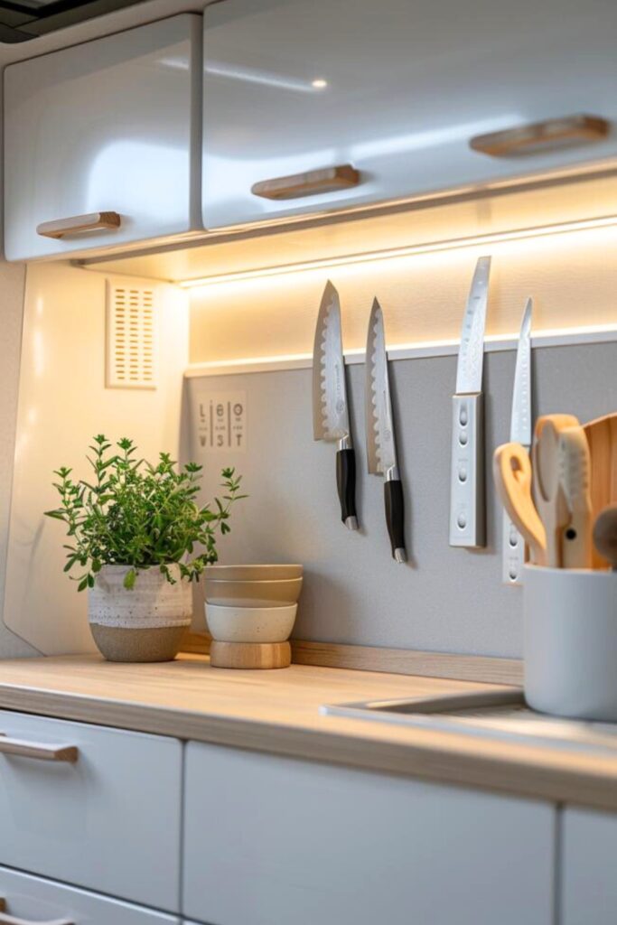 Free up drawer space by mounting magnetic strips on the walls or backsplash to store knives. This keeps them within easy reach while also adding a modern and streamlined look to your kitchen.