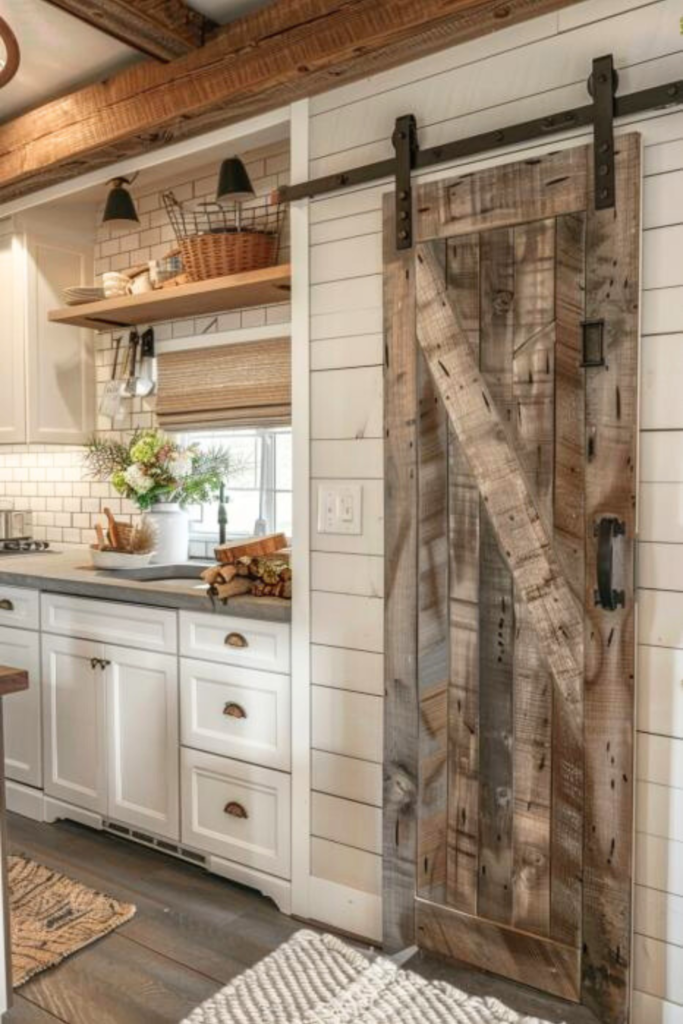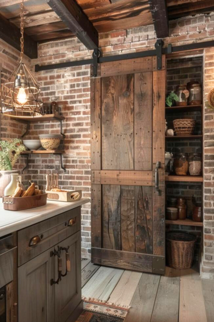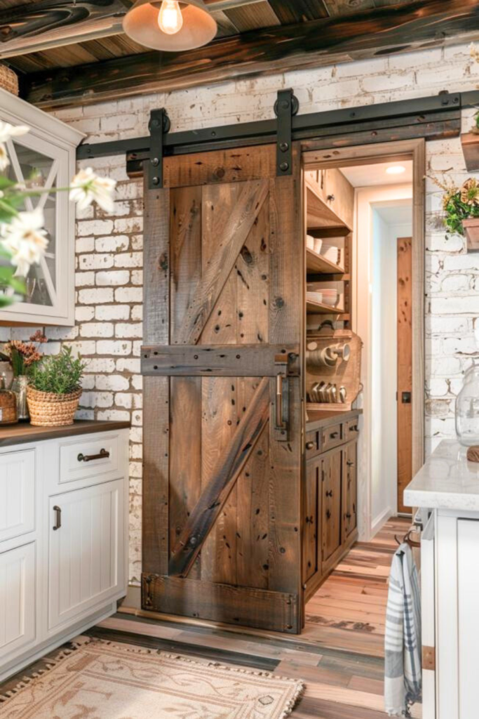 Opt for a sliding barn door instead of a traditional hinged door for accessing your kitchen pantry. This space-saving solution adds rustic charm to your kitchen while also allowing for easier access in tight spaces.