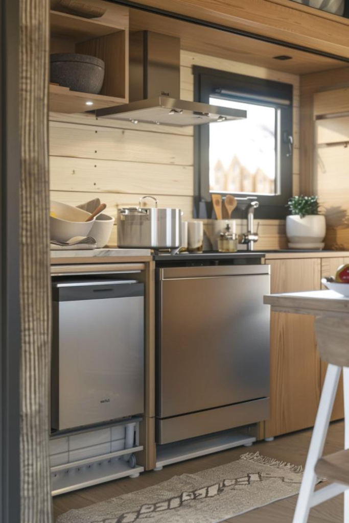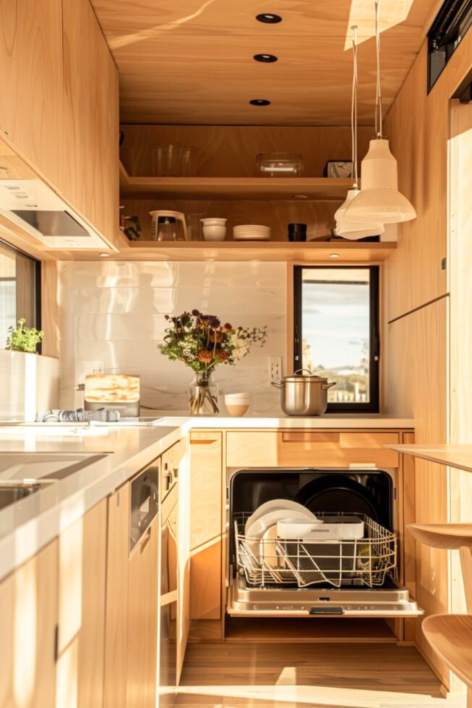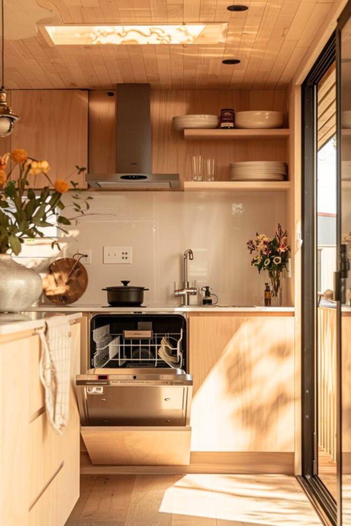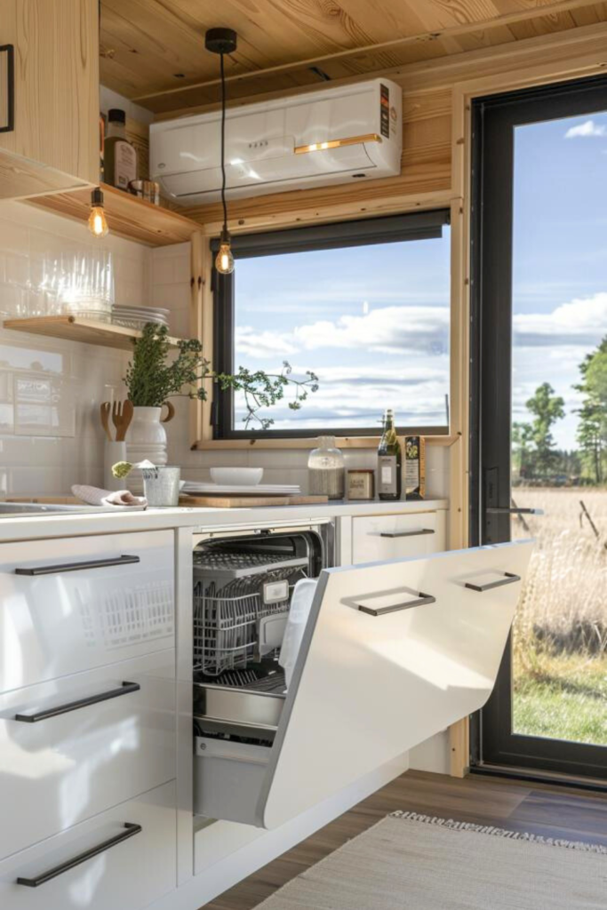 Invest in a compact dishwasher drawer that fits seamlessly into your tiny kitchen design. This allows you to enjoy the convenience of a dishwasher while saving space.