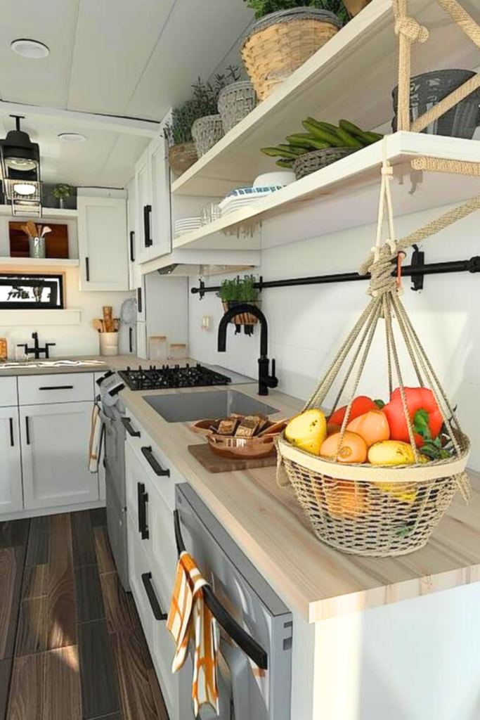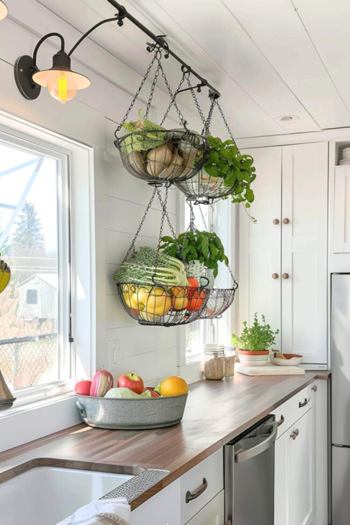 Create additional counter space by hanging produce baskets from the ceiling or walls. This space-saving solution keeps fruits and vegetables off the counter while also adding a decorative touch to your kitchen.